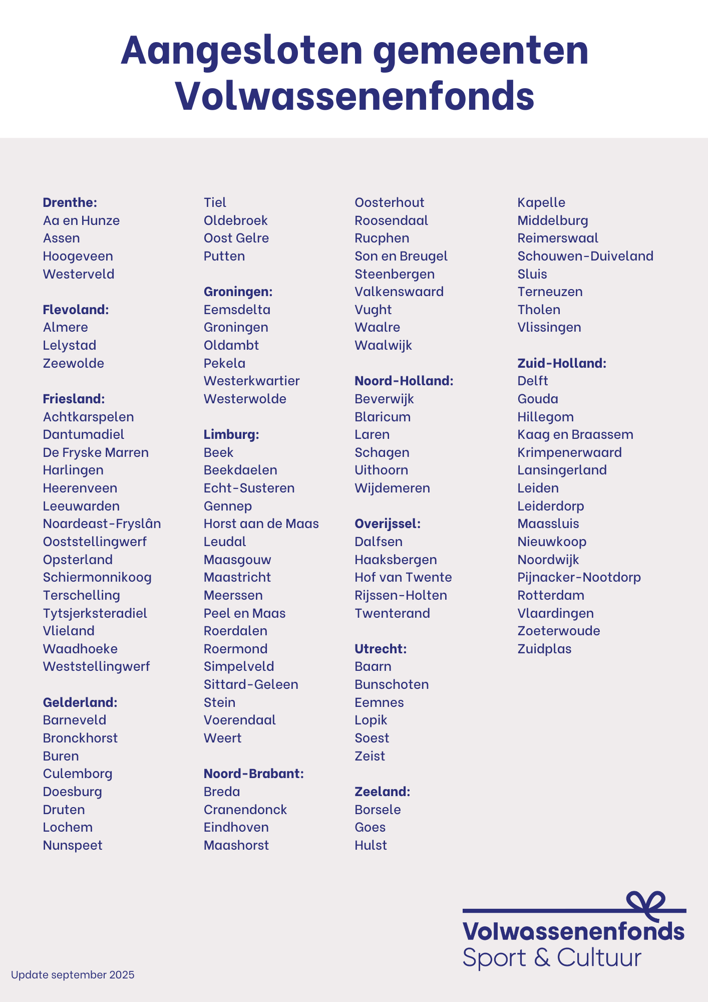In totaal hebben 113 gemeenten zich aangesloten bij het Volwassenenfonds Sport & Cultuur. Dit betekent dat volwassenen in deze gemeenten een aanvraag kunnen doen voor een sportieve of creatieve activiteit. Alle nieuwe gemeenten van harte welkom!