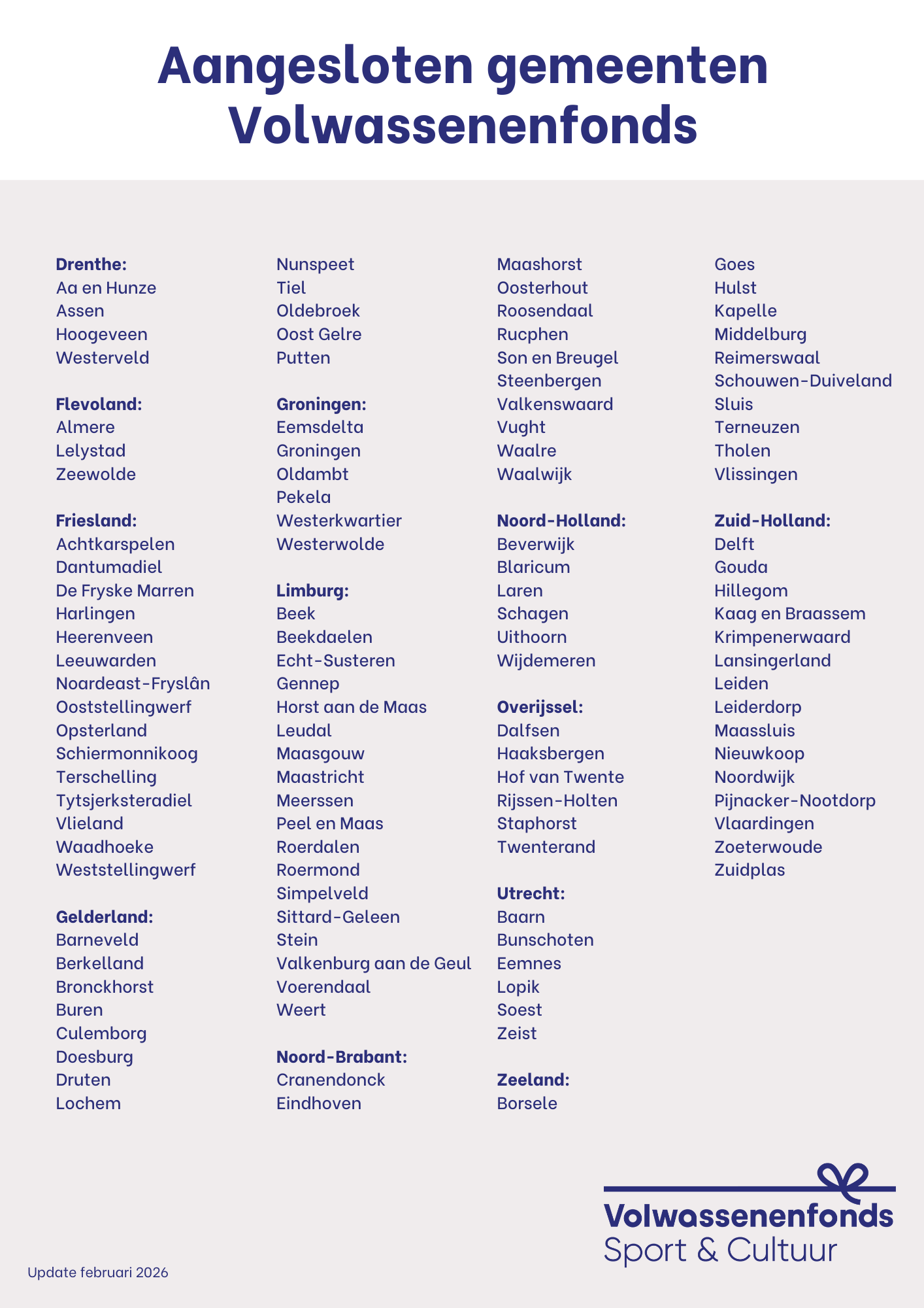 Wil je ook dat iedereen in jouw gemeente aan sport of cultuur kan doen? Werk dan samen met het Volwassenenfonds Sport & Cultuur. Jouw gemeente zorgt voor de financiën en bepaalt de kaders, wij regelen de rest. Kijk hieronder hoe dat werkt.