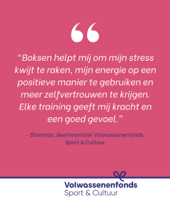 Shaimaa: “Ik doe aan boksen. De belangrijkste reden dat ik wilde gaan sporten, is dat ik sterker wilde worden. Ook helpt boksen mij om mijn stress kwijt te raken, mijn energie op een positieve manier te gebruiken en meer zelfvertrouwen te krijgen. Elke training geeft mij kracht en een goed gevoel.”
